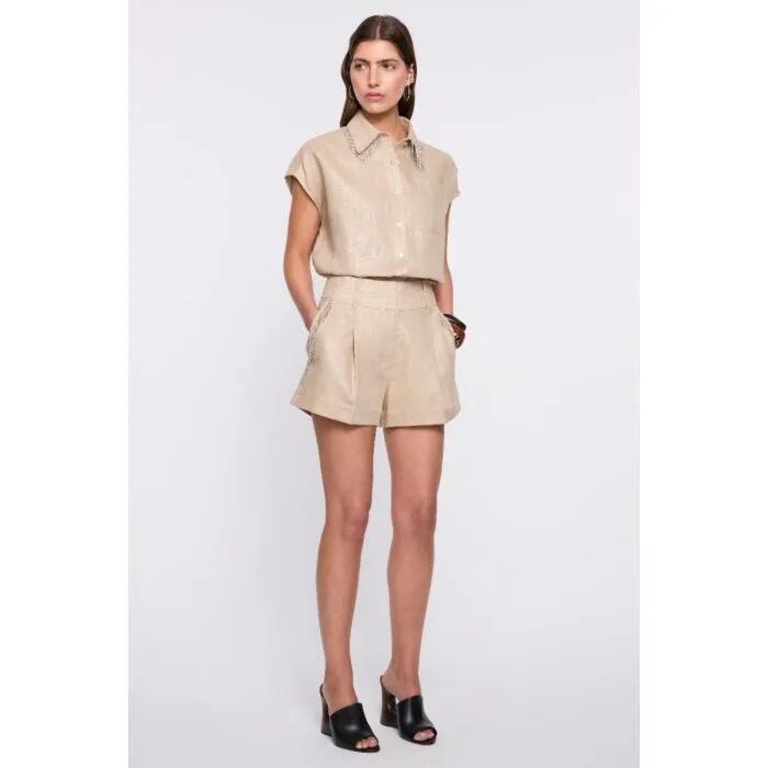 The Rain or Shine Shorts in Gilver Foil inject high-shine energy into classic tailoring. Cut from luminous metallic linen, the structured silhouette is defined by an architectural double waistband and kinetic metal fringing at the pockets that creates movement at every turn.