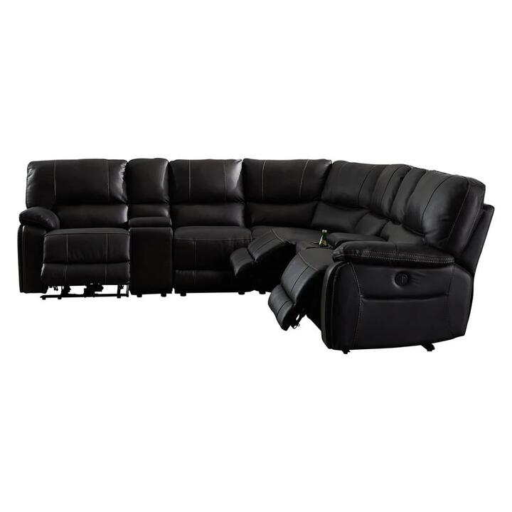Our Sofa presents an elegant look with its comfy pillow top cushions, appealing round shape and fine stich detailing. This contemporary corner sofa is upholstered with finest bonded leatherette and has both Left Arm Facing and Right Arm Facing recliners.
