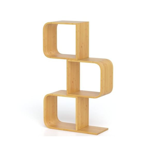S SHAPED BAMBOO BOOKCASE WITH OPEN CUBES The S-shaped design creates a visually striking display while 2 cubes make it easy to hold a variety of items, from books to decorative accents. Worried about safety? Don’t be! Our innovative bookshelf comes with anti-toppling kit for your peace of m