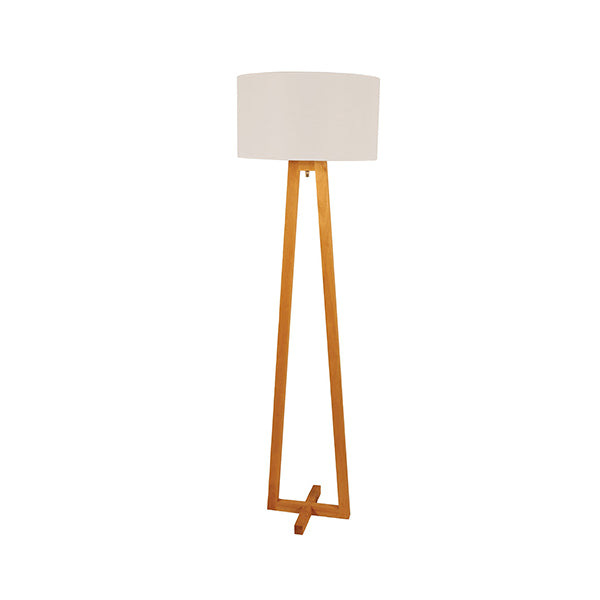 SCANDI FLOOR LAMP 240V 60W This geometric Scandi lamp features a stable cross-over base (300mm wide). The natural timber is finished with a light clear coating. Clear cord is 3m long and features an in-line foot switch.