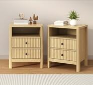 Enhance your space with the Set of 2 Venosa 2 Drawer Natural Bedside Tables, designed to bring both style and functionality into your bedroom. With a beautiful woodgrain texture and a unique rippled drawer front, these tables are not only visually appealing but also provide dependable storage sol