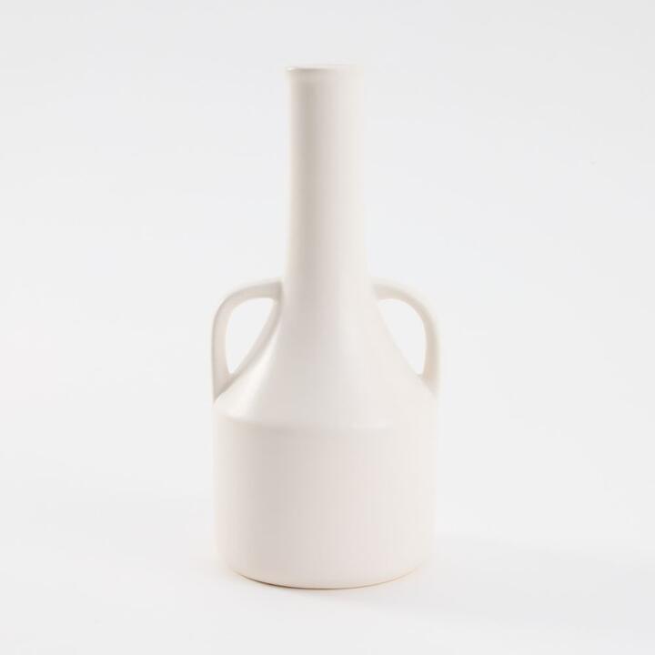 Add a sculptural element to your decor with the Shaynna Blaze Dacre Tall Vase, a thoughtfully designed piece that brings a modern edge to any room. With a crisp white finish and an eye-catching handle detail, this vase balances elegance and character.