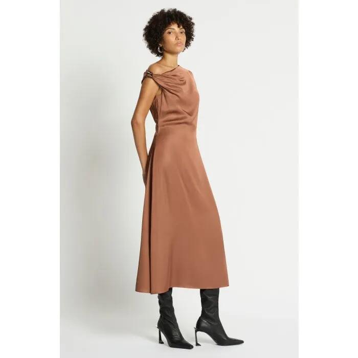 Undeniably exquisite in decadent acorn brown, this dress slips over the skin in soft viscose satin sweeping to an appealing midi length. Worn off the shoulder, the dress uses asymmetrical neck and sleeve bodice design to create intrigue which is further impressed upon with a detachable snake chai