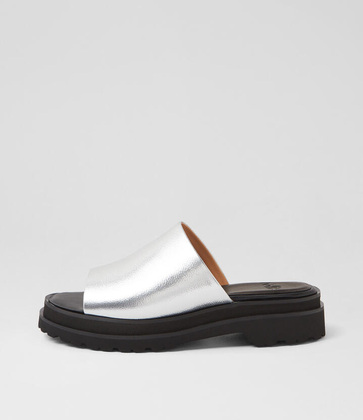 Slide Step Silver Black Leather Slides