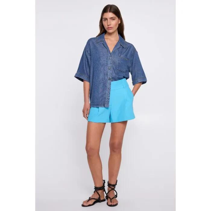 The Song Bird Shirt in Indigo offers a fresh take on the classic button-up with subtle rebellion. This relaxed short-sleeve denim shirt features a traditional collar and chest pocket, elevated by silver hotfix detailing that catches the light.