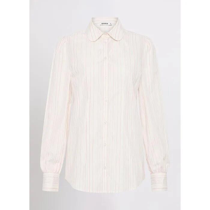 Sitting soft against the skin in cool, crisp cotton, this long sleeve shirt pairs back seamlessly within your wardrobe, as it shows off a metallic silver and pink stripe set against ivory. Framing the face with a peter pan collar, the shirt reveals a flattering slim silhouette to a softly curved