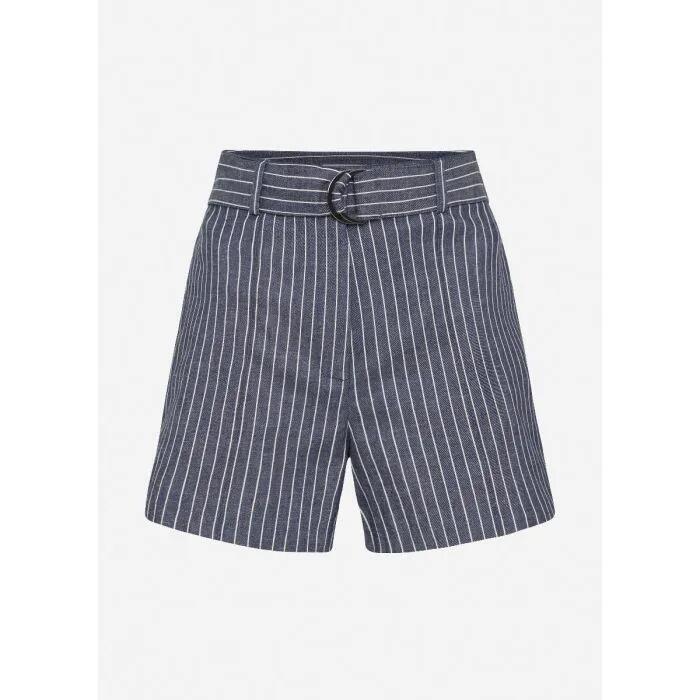 Elevating your summer wardrobe with a smart ivory pinstripe, these navy shorts deliver flattering shaping within a slim, tailored design, while offering easy movement through pure stretch cotton. Defining the waist with a silver D-ring belt, the shorts fasten discreetly at the front with conceale