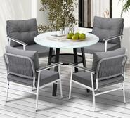 Elevate your outdoor dining experience with the Tobago Grey 4 Seater Outdoor Dining Set. Featuring a stylish white ceramic tempered glass top and sturdy steel frame, this set is both chic and durable, making it perfect for alfresco meals under the sun or stars.
