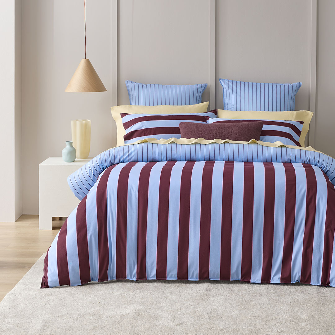 The lookMake a statement with the Tobie reversible quilt cover, bringing together classic stripes and bold contrasting shades. Made from soft, prewashed cotton, this eye-catching design features burgundy and sky blue stripes for a fresh, versatile look that brings energy and personality to any sp